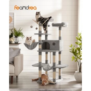 ALL-IN-ONE VERGNÜGUNGSPARK: Nickerchen machen, entspannen, dehnen, spielen… Dieser Kletterbaum bietet zahlreiche VIP-Services. Er verfügt über 2 große Plattformen, 1 Katzenhaus, 1 Hängematte, 1 Liegemulde, 3 Stäbe mit Fellbällchen und 1 Sisalseil
