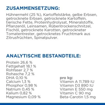 Ihr kleiner Welpe wächst schnell und benötigt ein hochwertiges Hundefutter, das seinen wachsenden Bedürfnissen gerecht wird. Hill’s Science Plan No Grain Puppy Trockenfutter mit Huhn besteht aus ausgewogenen Zutaten und Mineralstoffen, die die Entwicklung von Welpen fördern – für den besten Start ins Leben und ein gesundes Wachstum. Die Welpennahrung enthält DHA aus Fischöl, um die Entwicklung des Gehirns und der Augen Ihres heranwachsenden Hundes zu unterstützen, sowie hochwertiges Protein für den Aufbau schlanker Muskelmasse. Ein ausgewogener Mineralstoffgehalt unterstützt das Knochenwachstum und sorgt für starke und gesunde Zähne. Das Hundefutter wurde auf Basis jahrzehntelanger innovativer Forschung entwickelt und bietet einen hervorragenden Geschmack, den Welpen lieben.