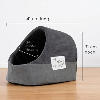 Die KaraLuna Kuschelhöhle ist ideal für Katzen, Kitten, kleine Hunde und Welpen. Unser Katzen Bettchen bzw. Hundebett ist 36 cm breit, 41 cm lang und 31 cm hoch. Der KaraLuna Katzen Schlafplatz ist daher auch für große Katzen geeignet. Die KaraLuna Katzenhöhle überzeugt durch einen schönen und modernen Stoffmix mit edlem Aufnäher. Die robusten und tierfreundlichen Materialien der Katzen Höhle halten auch verspielten Katzen stand. Dank der Anti-Rutsch Noppen hat das Katzenhaus Indoor einen stabilen Halt. Bei Bedarf lässt sich das eingelegte Kissen einfach herausnehmen und enthaaren oder mit der Hand waschen.