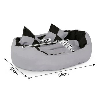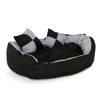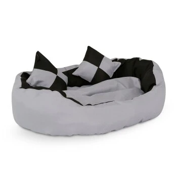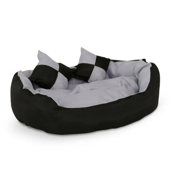 Dieses formschöne Hundebett aus robustem Oxford-Material bietet Ihrem Vierbeiner einen gemütlichen Schlaf- und Rückzugsplatz. Das wendbare Körbchen und Bodenkissen sorgen dafür, dass Sie 4 verschiedene Designs passend zu Ihrer Wohnsituation nutzen können. Ein tiefer Einstieg erleichtert Tieren jeder Größe den Zugang zum Hundebett. Die zwei zusätzlichen Spielkissen sind bestens zum Spielen und Toben geeignet. Natürlich können Sie das Bettchen auch als Katzenkörbchen nutzen. Zur Reinigung reicht ein feuchtes Tuch.