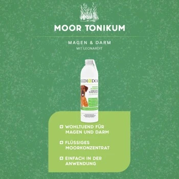 Das Tonikum optimiert die Kotbeschaffenheit deines Hundes. Selbst unangenehme Gerüche können neutralisiert werden. Das vitalisierende Moorkonzentrat ist natürlich und wirkt wohltuend auf deinen Hund.