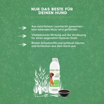 Das vitalisierende Medidog Heilmoor Konzentrat ist ein flüssiges Extrakt aus natürlichem Leonardit mit einem hohen Anteil an Huminstoffen. Dadurch wird der Magen-Darm-Trakt deines Hundes wieder harmonisiert und in seiner natürlichen Funktionalität gestärkt.