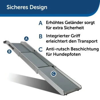 Die Teleskoprampe eignet sich perfekt, um Ihrem Hund das Ein- und Aussteigen in Ihr Auto, Ihren Minivan oder SUV zu erleichtern und seine Gelenke zu schonen. Dank des Teleskopdesigns können Sie die Länge der Rampe entsprechend Ihrem Fahrzeug ausziehen. Die rutschfeste Oberfläche und die seitlichen Führungen ermöglichen ein sicheres Ein- und Aussteigen.