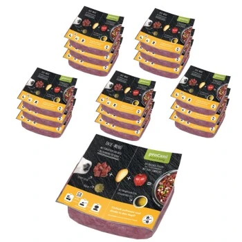 Mit unserem Enten-Menü frisch und fertig kannst du deinen Hund schnell und einfach mit jeder Menge Energie und vielen wertvollen Vitaminen, Mineralien und Spurenelementen versorgen. Das fetthaltige Entenfleisch ist besonders für aktive oder untergewichtige Hunde ideal. Aufwendige Futterpläne benötigen Sie mit diesem Premiumfutter nicht. In unserem optimal abgestimmten BARF-Menü ist bereits alles drin, was eine vollwertige Mahlzeit ausmacht. Das Fleisch ist angereichert mit Äpfeln, Kartoffeln und Öl. Kartoffeln enthalten überwiegend Phosphor, Eisen und Magnesium und sind ein guter Energielieferant. Die Pektine aus Äpfeln binden Gifte im Dünn- und Dickdarm und helfen bei deren Ausscheidung.