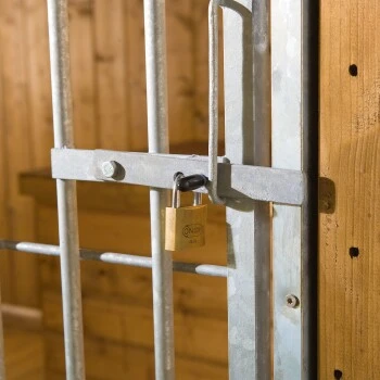 Die Front des Zwingers besteht aus einem 1 oder 2 m breiten geschlossenen Holzelement (abhängig von der Zwingerbreite, 3 oder 4 m) und einem 2 m breiten feuerverzinkten Rohrstabelement mit Tür. Diese ist rechts im Element eingearbeitet und geht nach innen auf. Der Türriegel kann mit einem Schloss gesichert werden.