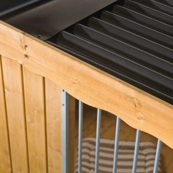 Der Hundezwinger Charly mit Satteldach ist unter anderem mit Rohrstäben verarbeitet, die Ihren Hund am Aufspringen oder Klettern hindern. Das beugt Haltungsschäden und Verletzungen vor. Zusätzlich bietet der Zwinger eine integrierte Hundehütte (ca. 115 x 76 x 80 cm) als Rückzugsmöglichkeit.