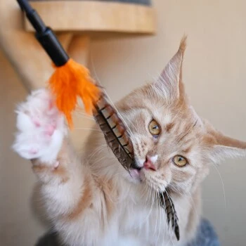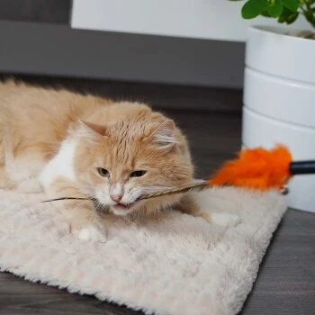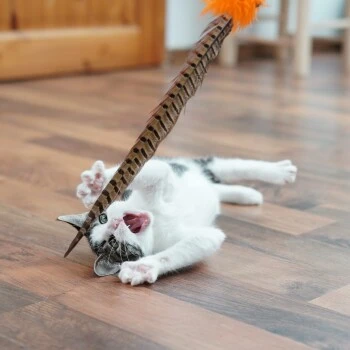 Bitte beachte: Die Lebensdauer der Federwedel ist begrenzt. Je mach Temperament der Katze brechen die Federn früher oder später. Dann ist es Zeit für einen neuen Federstab.