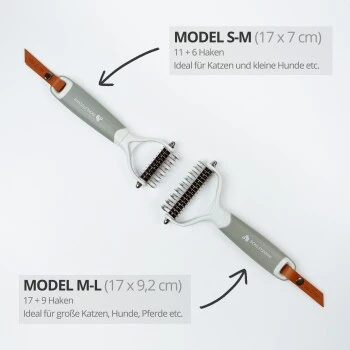 Den SCHLITZOHR Unterwollkamm gibt es in 2 verschiedenen Größen. Größe S-M eignet sich besonders gut für kleine Hunde und Katzen, während sich Größe M-L besonders bei großen Katzen, großen Hunden und Pferden bewährt hat.