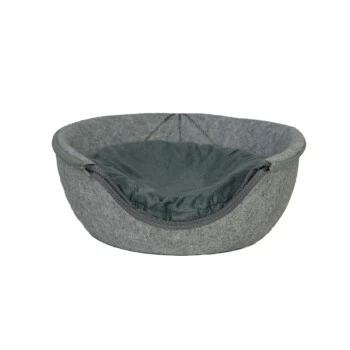 Diese Katzenhöhle aus wärmeregulierendem Filz ist eine gelungene Kombination von Körbchen und Höhle. Ober- und Unterteil sind durch einen Reißverschluss zu einer Kuschelhöhle vereint und können so aber auch einfach voneinander getrennt werden. Die Unterschale kann solo als Ruhekorb genutzt werden. Um das Liegen noch bequemer zu gestalten, liegt dem Lieferumfang ein weiches Kissen (Ø ca. 37 cm) bei. Es enthält eine Vliesfüllung. Der Bezug ist nicht abnehmbar und durch Handwäsche zu reinigen. Drei schöne Ziernähte auf der Oberseite, durchbrechen die schlichte Form.