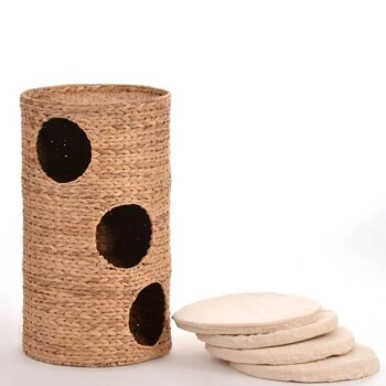 Kletterspaß und Rückzugsmöglickeit bieten Sie Ihrem Liebling mit dieser Katzentonne. Das weiche Geflecht aus Wasserhyazinte fügt sich harmonisch in jedes Wohnambiente ein. Für besondere Gemütlichkeit sorgen die vier weichen Kissen, die sich jeweils in den drei Höhlen und auf dem Dach befinden (herausnehm- und waschbar).