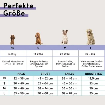 Durch den langen Unterbruststeg hat man einen bewegungsfreundlichen Abstand zu den Vorderbeinen, dass somit die Achseln deines Lieblings schont.