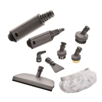 Im Lieferumfang enthalten: Dampfbodendüse mit Drehgelenk und Reinigungstuch, Fensterdüse, Schaber, Punktstrahldüse, Zubehöradapter, Rundbürsten (1x groß, 1x klein mit Messingborsten, 1x klein mit Hartborsten), 3 Verlängerungsrohre inklusive Kabelhalterung.