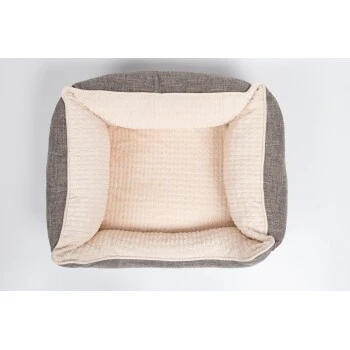 Das hochgepolsterte Hundebett ist in zwei Farbkombinationen erhältlich: Beiger Innenstoff und braun melierter Außenstoff / Grauer Innenstoff und grau melierter Außenstoff
