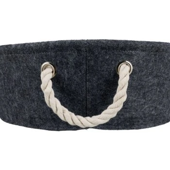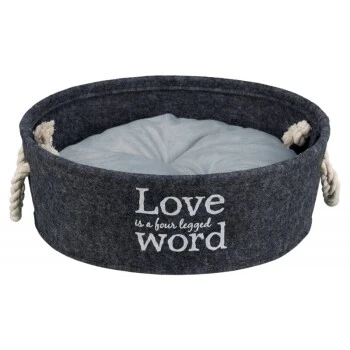 Das schlichte Bett mit schönem Schriftzug „Love is a four legged word“ passt perfekt in verschiedenste Einrichtungsstile. Das Filzmaterial bietet einen tollen Blickfang – die dekorativen Handgriffe aus Baumwoll-Tau runden das Design ab.